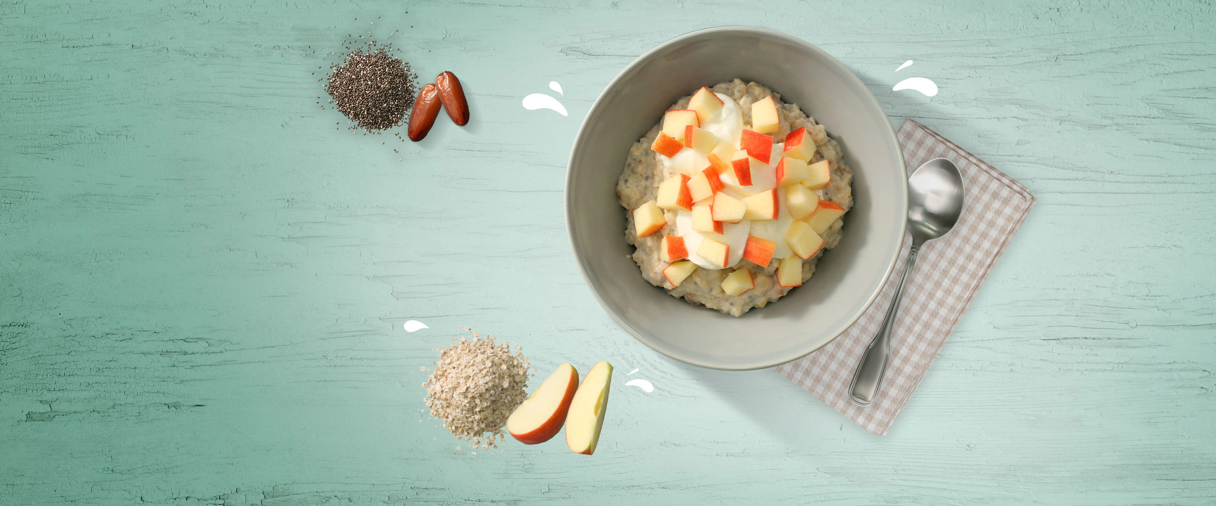 Remove the stones from the dates and cut them into smaller pieces. Cook oatmeal, milk, chia seeds, dates and salt in a saucepan. Cook it until the desired consistency - remember to stir regularly. Serve the porridge in a bowl topped with skyr and apple.