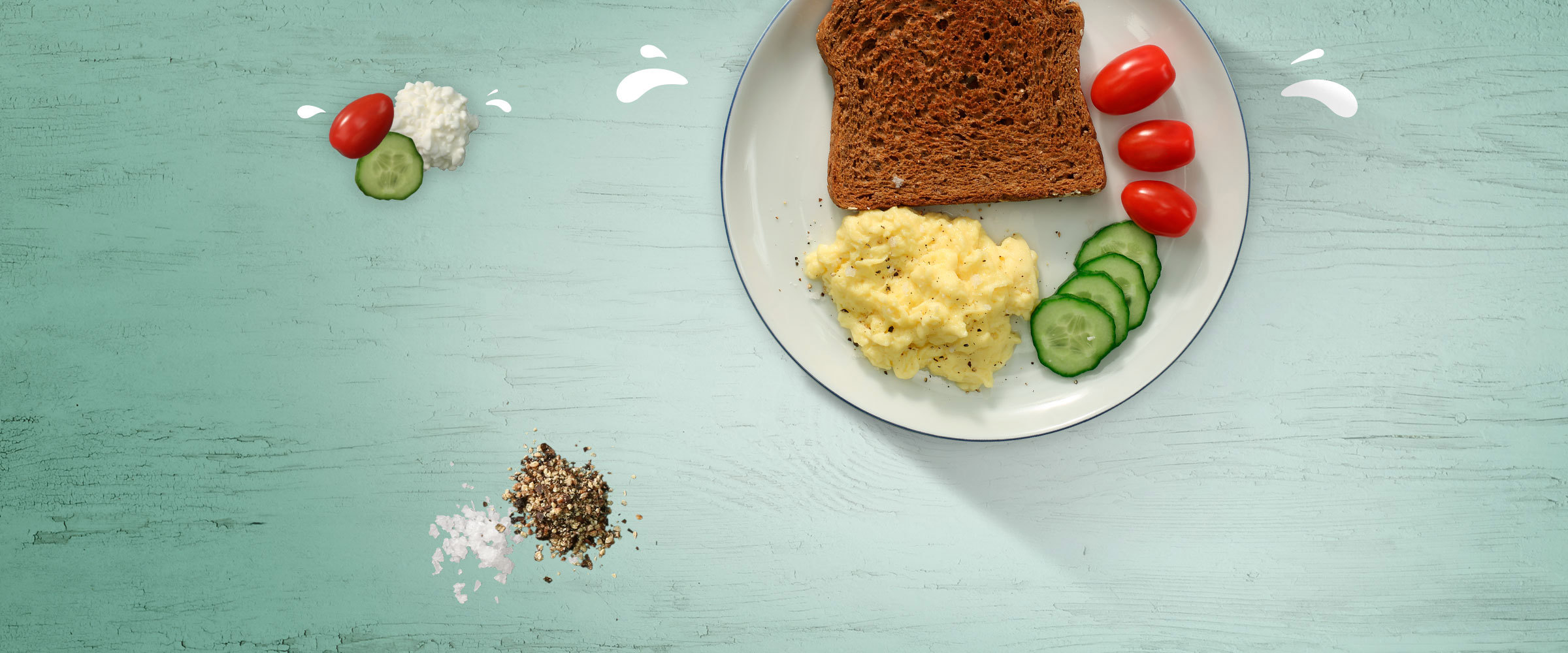 Beat the egg, whip the cottage cheese with the egg and cook it in the pan over high heat. Toast the bread. Serve scrambled egg with roasted bread, tomatoes, cucumber, salt and pepper.